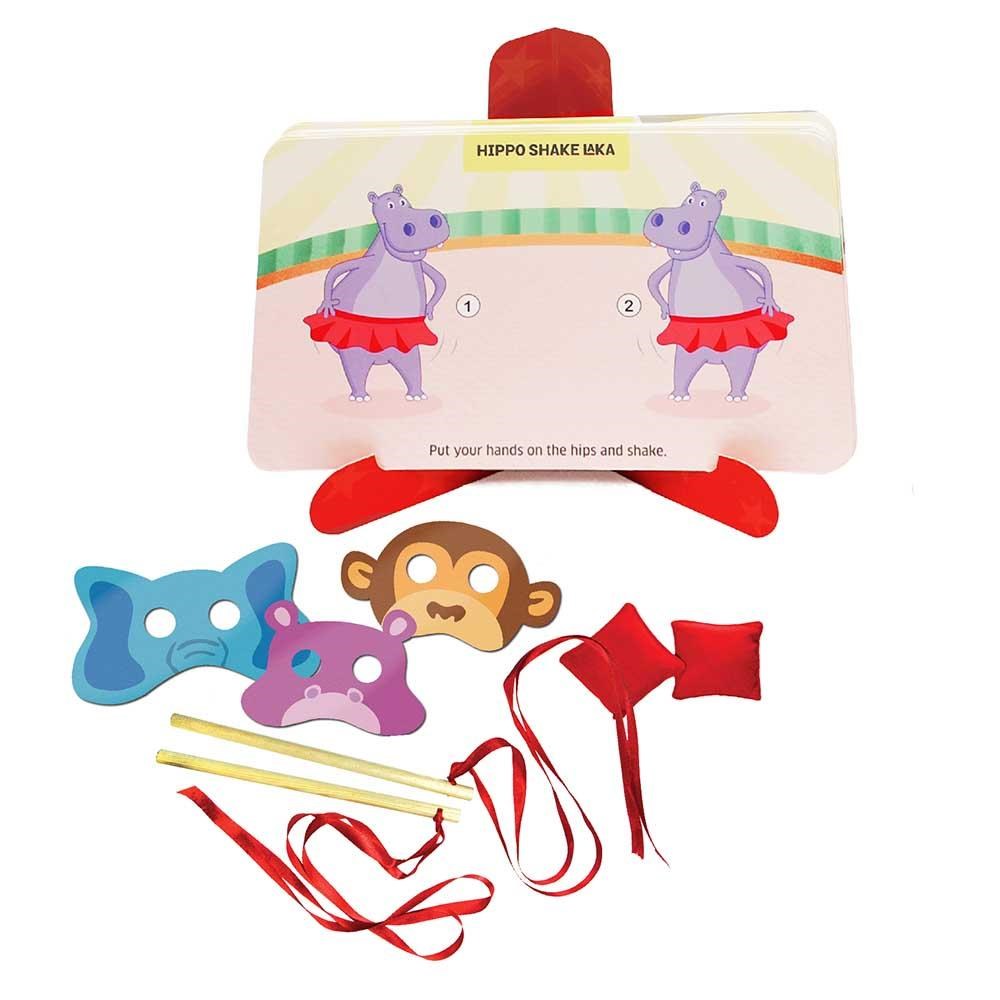 It’s showtime and get ready for a performance under the ‘Big Top’. The Lion Tamer and his troop of ferocious Lions, Tigers and Bears take over the stage. Time for roaring and wildness with acts like Goofie Footsie or the fireworks dance! Do the shake and the twists, the jumps and the leaps, whistle and hoot for endless fun. Roll the die and see who’s turn it is to perform- the monkey, the lion, hippo or the elephant? Pick a card and join the fun to imitate the actions of the crazy circus team. Keep the card after a spectacular performance. The player with the most cards wins.