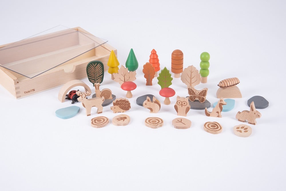 Set includes: Sensory Mood Discovery Table, Wooden Dinosaur Blocks Pk10, Seasonal Woodland Tress Pk10, Forest Discovery Play Mat, Jurassic Discovery Dividers, Wooden Minibeast Blocks Pk15 & Woodland Trail Set Pk36 + box.