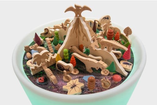 The mat is semi-translucent, so changing the light colour will illuminate the forest features in a range of ways. With lasered detailing on the dividers and wooden dinosaur blocks, tactile woodland trees and trail sets, and double-sided minibeast picture blocks, the scene is set for creative play, encouraging descriptive language, developing motor skills and learning about the history of our world.