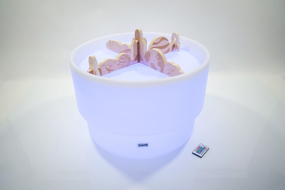 The light-up table has a raised edge to contain the play mat and wooden 4-way dividers, creating an inviting area for imaginative play.