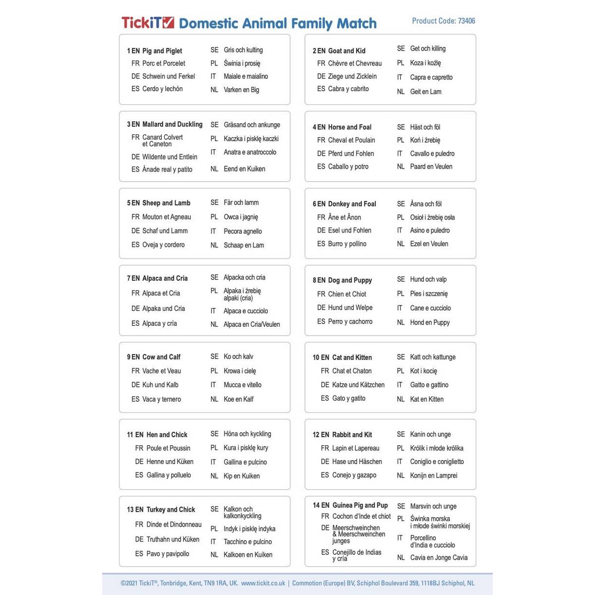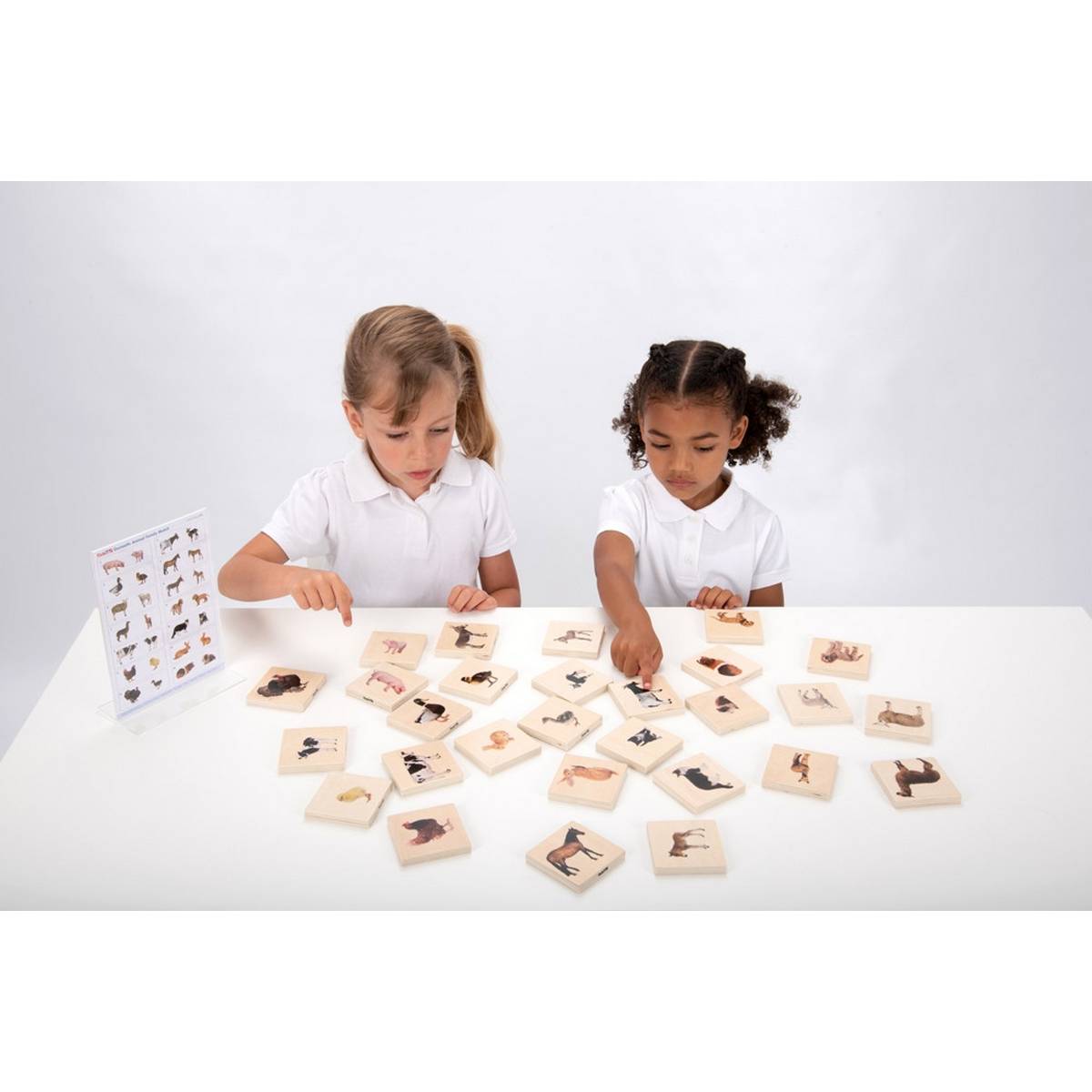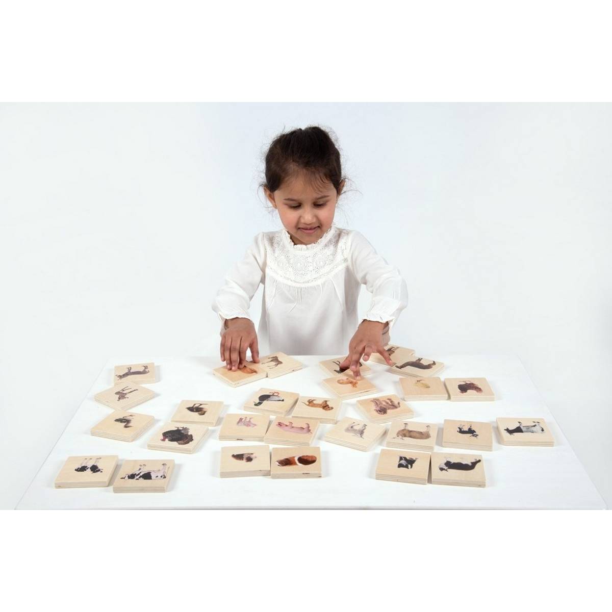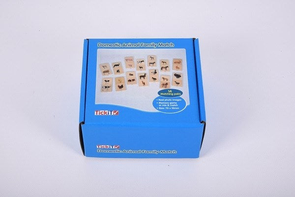 14 pairs of smooth and tactile beech plywood square tiles, each colour printed on one side with clear detailed photographic images of real domestic animal adults and their young. The chunky tiles are easy for small hands to grip, rotate and turn over.