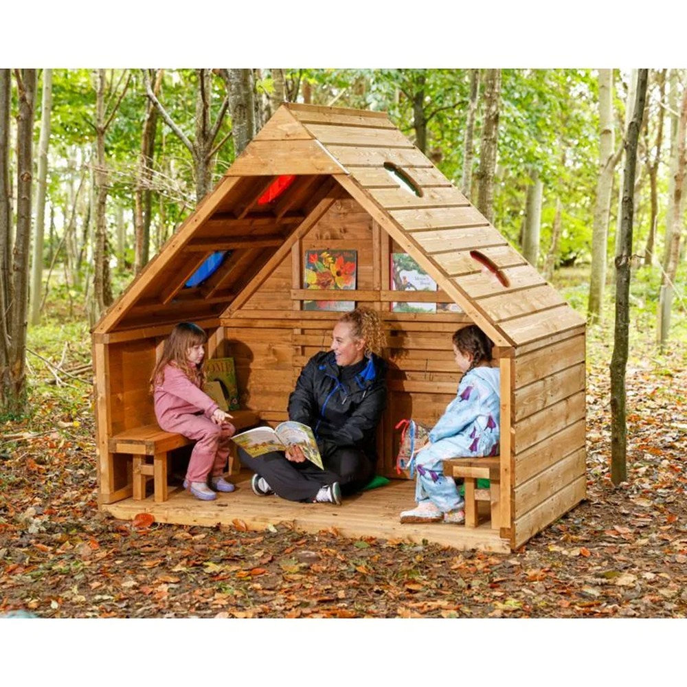 The gable style roof features circular cutout windows with the classic coloured perspex covers, adding a splash of colour and a touch of magic as sunlight filters through. We've added wooden slats to the back of the shelter, creating a perfect place for hooking additional resources, and the handy space to display books.