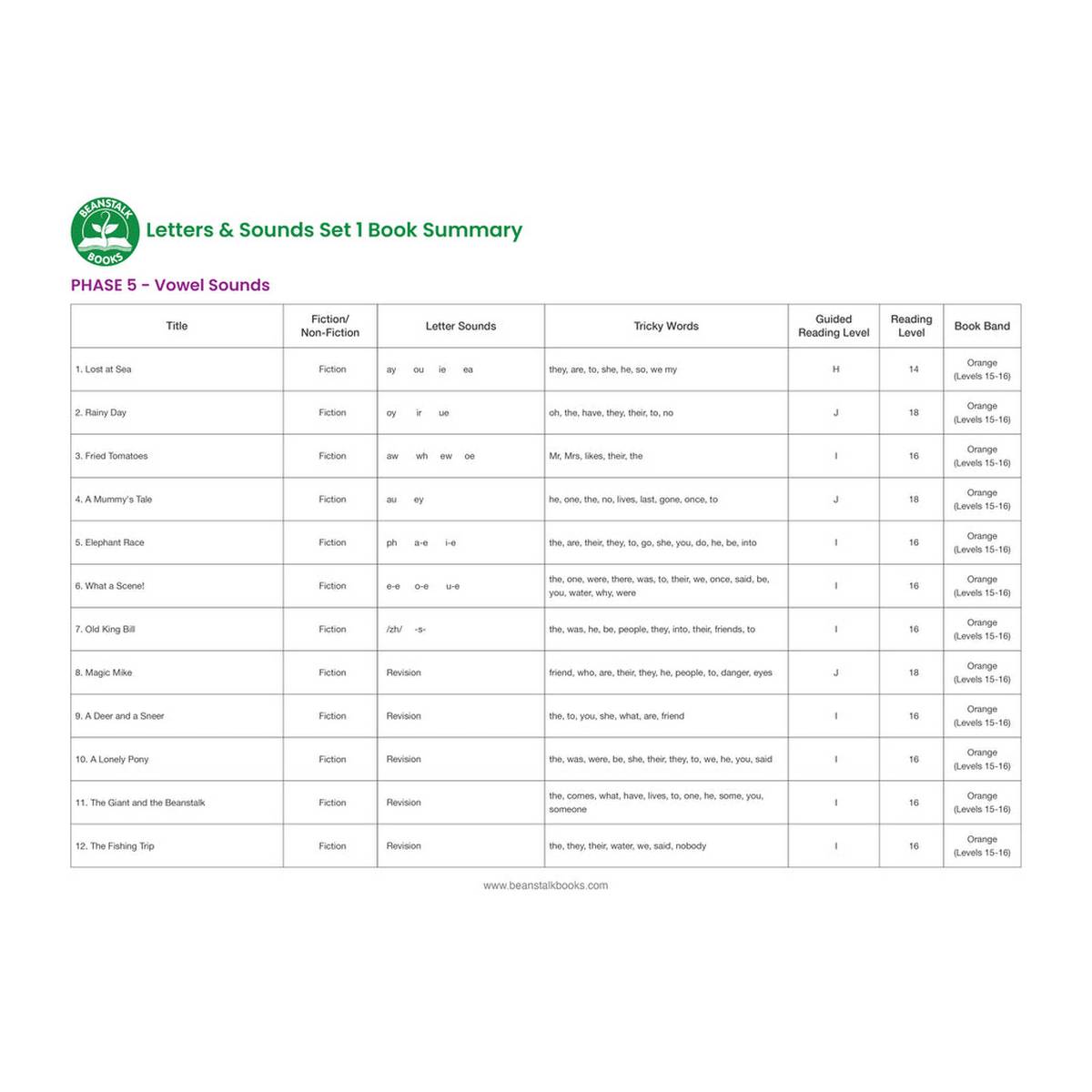 Vowel Sound readers introduce a further 20 letter patterns, mainly focusing on alternative vowel sounds. Text uses only decodable regular words (according to the week by week progression) along with 'tricky words'. Phase 5 readers have a strictly controlled vocabulary that follows the letter-by-letter progression.