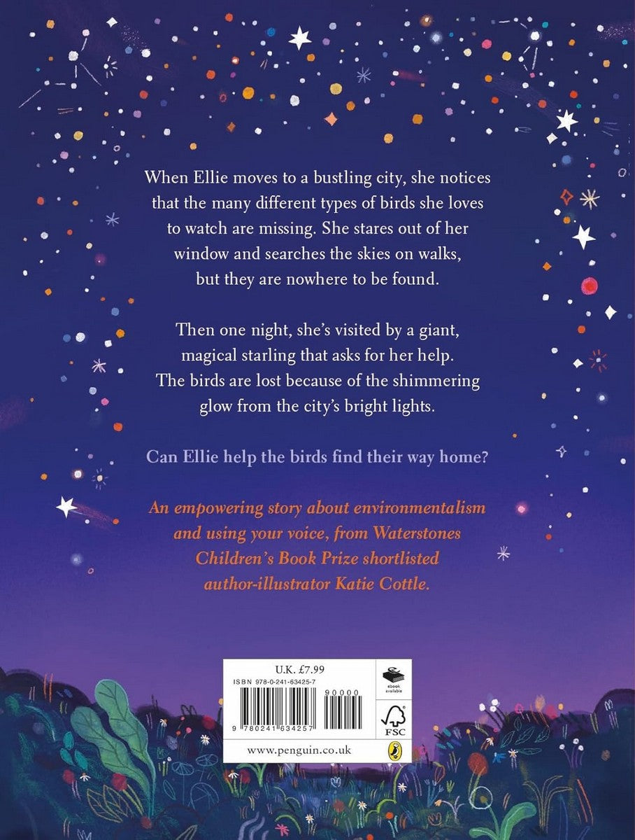 From author-illustrator Katie Cottle comes a breath-taking journey about light pollution and saving the birdsWhen Ellie moves from her quiet village to a bustling city, she finds that the many different birds she loves to watch are missing. She stares out of her window, searches the skies on walks, but they are nowhere to be found. Then one night, she's visited by a giant starling which asks for her help.