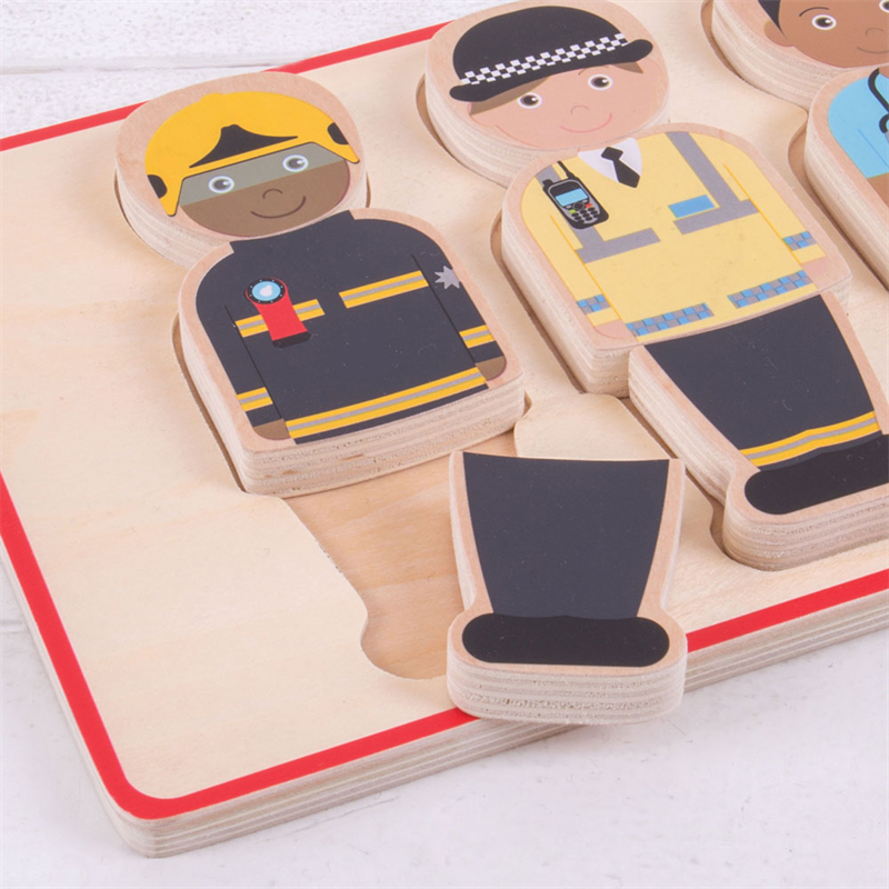 chunky wooden puzzle features 6 emergency workers including a Fire Fighter,