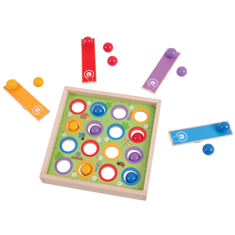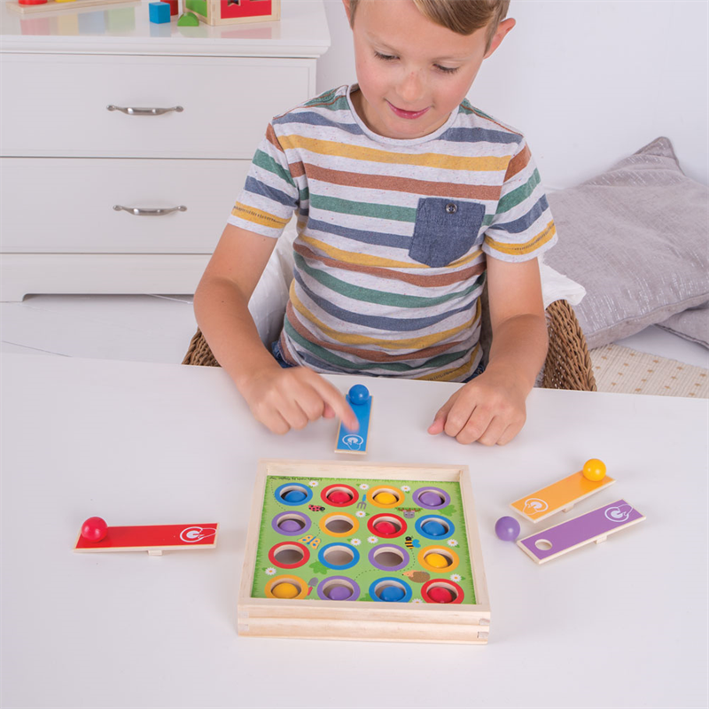 A game that is sure to test skill and accuracy! Players must take it in turns to flip a coloured ball in to its corresponding hole on the board. The player who manages to pot all four coloured balls into the holes first wins!