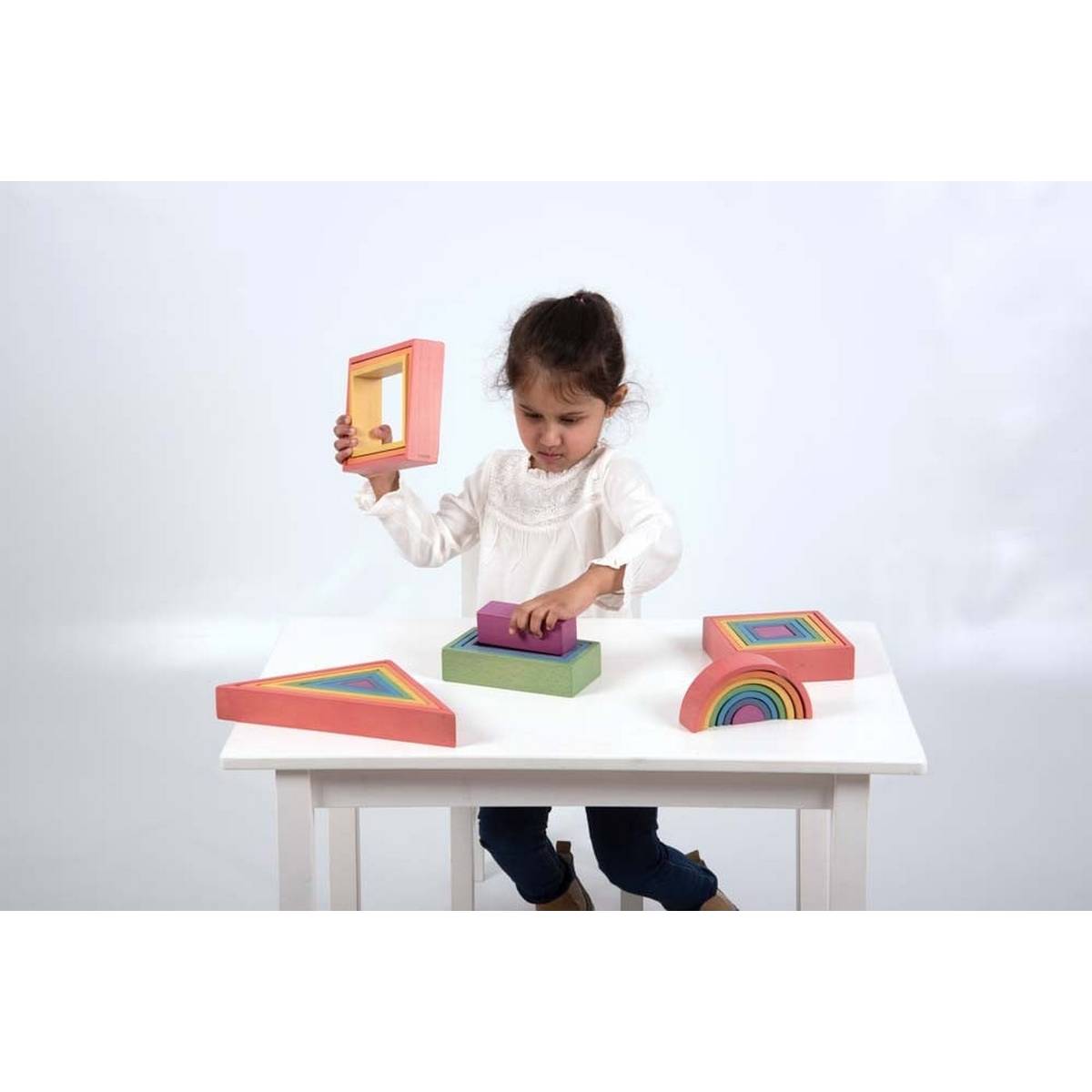 Beautiful smooth solid beechwood nesting rectangles in the seven colours of the rainbow, with a natural finish to show the grain of the wood. The inner block is a solid 3D rectangle.