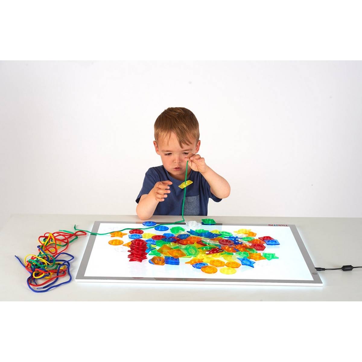 Set of mixed shape translucent plastic buttons in 6 colours with 1, 3 or 5 holes in the centre. Ideal for using on a light panel for sorting and counting activities, or for developing fine motor skills by stacking or threading with the laces included. Red, orange, yellow, greeen, blue and clear; Star, circle, hexagon and square. Comes in a convenient storage container.